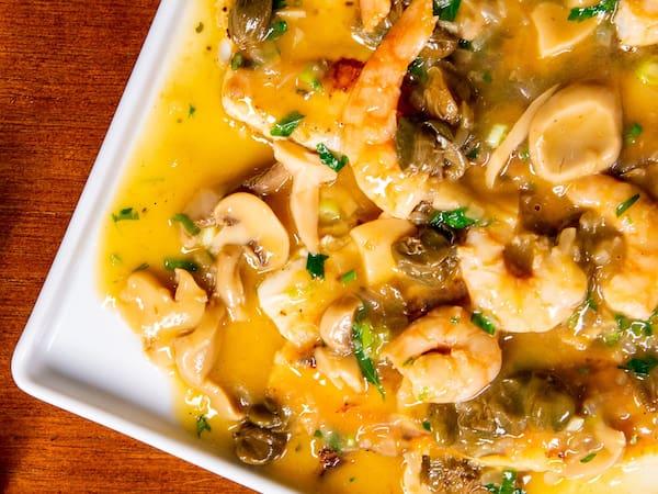 Filé da estação fresquinho ao tradicional molho de champignon e alcaparras acompanhado de arroz e batata soute.